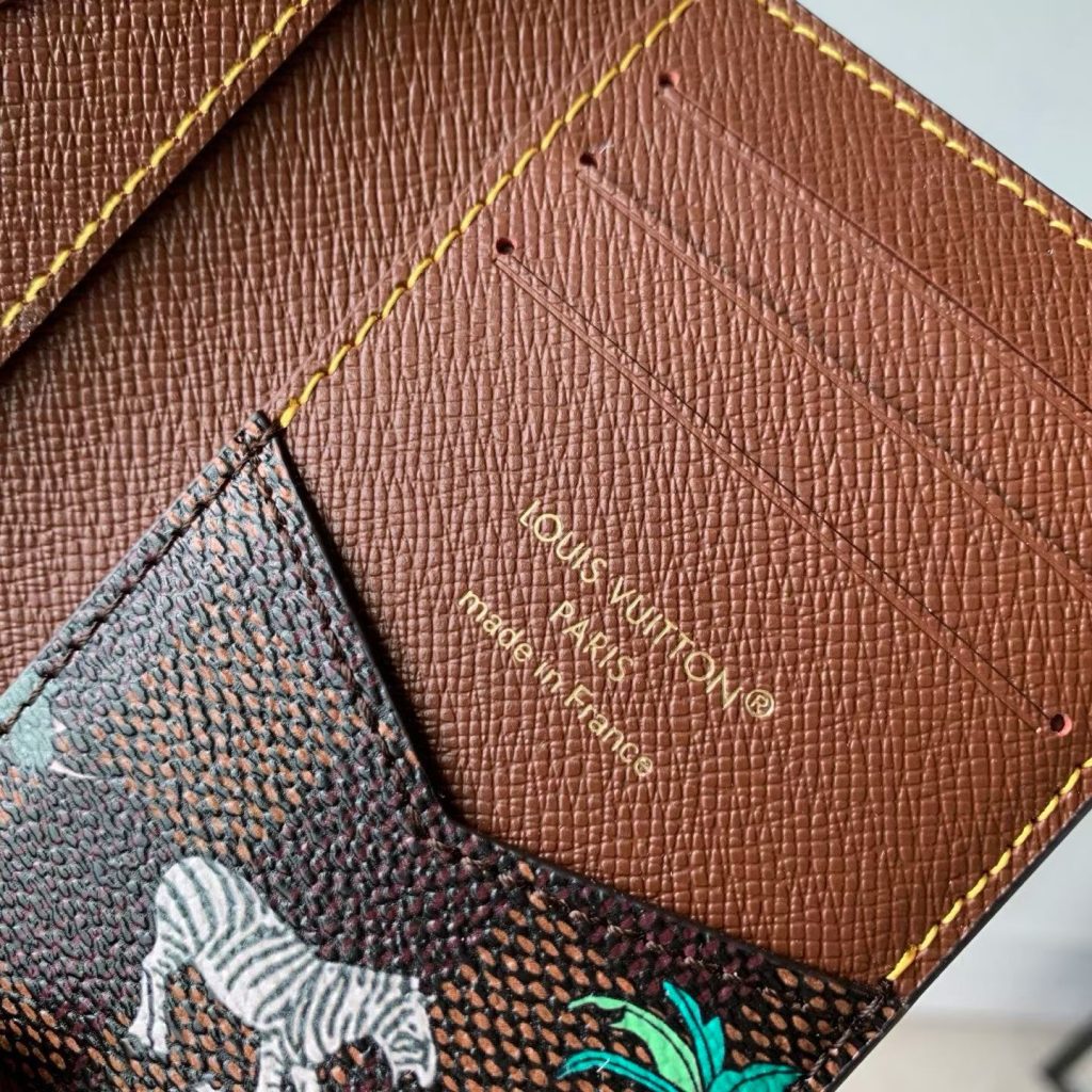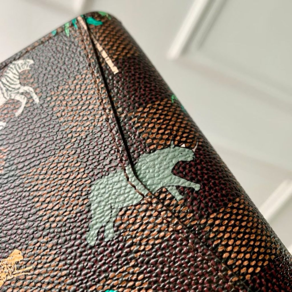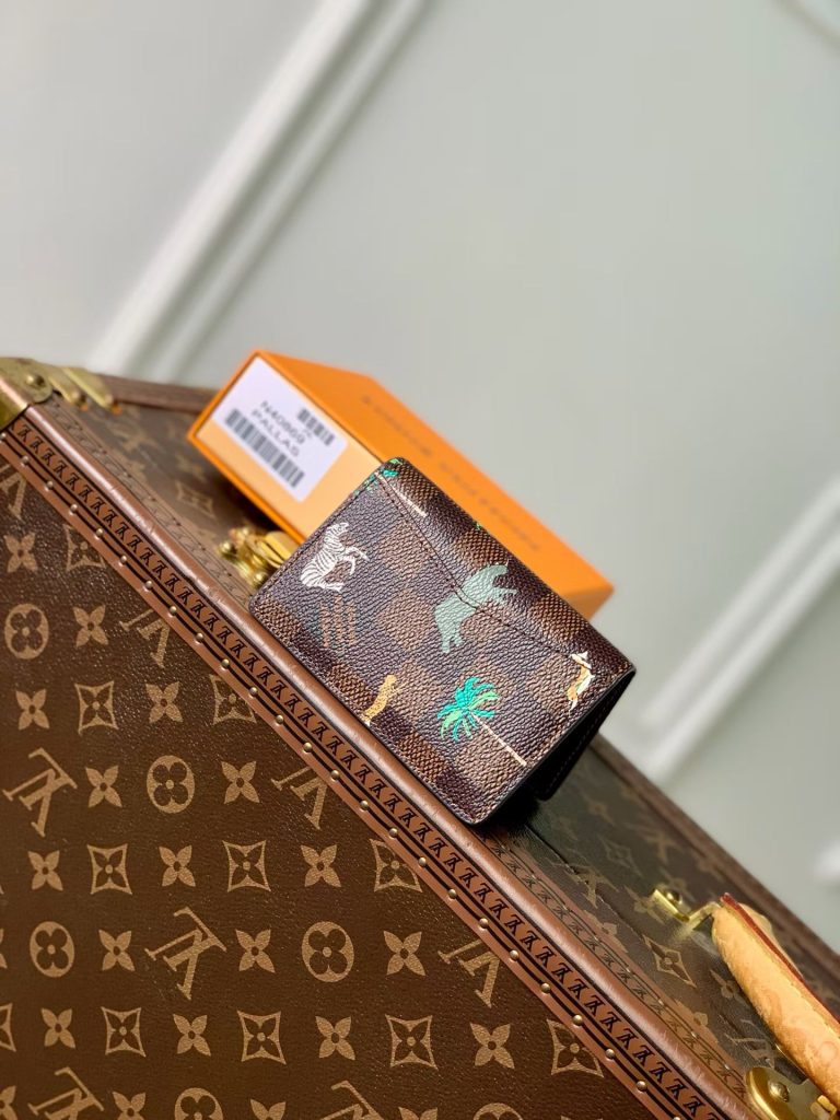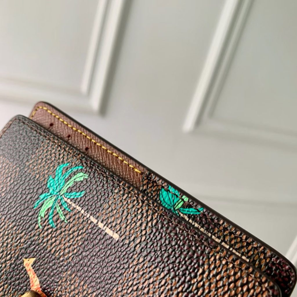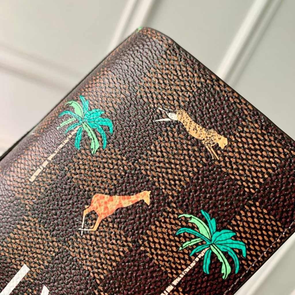 L’organizer tascabile assume un aspetto ironico grazie alla tela Damier Heritage, il cui motivo a scacchiera è animato da vivaci animali in movimento e palme sia all’interno che all’esterno. Le audaci iniziali L.V. color bianco sulla parte anteriore richiamano i celebri bagagli Louis Vuitton apparsi nel film The Darjeeling Limited. Cinque tasche interne, tre fessure per carte e una tasca esterna garantiscono la massima funzionalità.